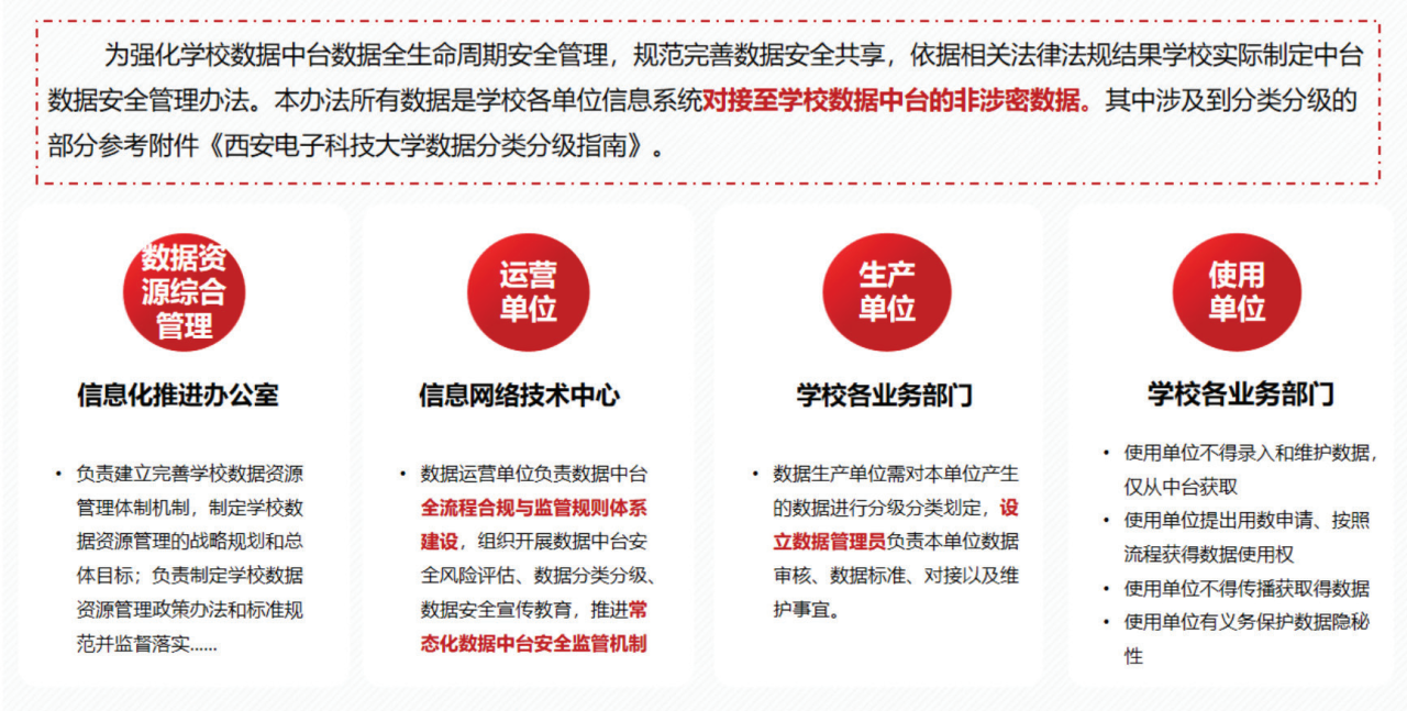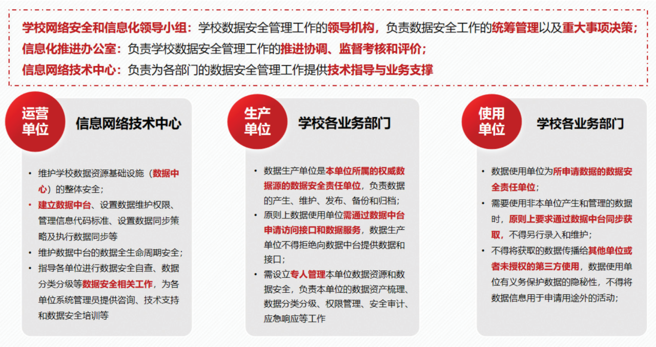 在校级《数据安全管理办法》中,学校网络安全和信息化领导小组是学校数据安全管理工作的领导机构,负责数据安全工作的统筹管理以及重大事项决策。数据安全责任单位包括数据生产单位、数据使用单位、数据运营单位,三类单位各司其职,负责学校数据不同层面的安全。