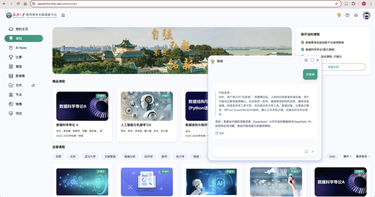 得益于DeepSeek大模型的接入,武汉大学的智慧教学平台——珞珈在线和数智教育实践创新平台迎来了新的升级。师生可以在一个平台上完成图文教学、代码实训、科研竞赛、科研计算,实现学练一体、研学一体。