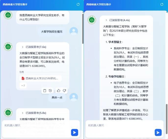 为提升研究生招生咨询的效率与精准度,学校开发了研究生招生AI助手。该助手深度整合DeepSeek-R1大语言模型和nomic-embed-text词嵌入模型,构建了本地化的研究生招生专有知识库。考生和家长可随时随地获取关于西南林业大学研究生招生的全方位信息。无论是招生政策、专业设置、导师信息,还是考试大纲、复试流程等细节问题,AI助手都能迅速、准确地提供解答。