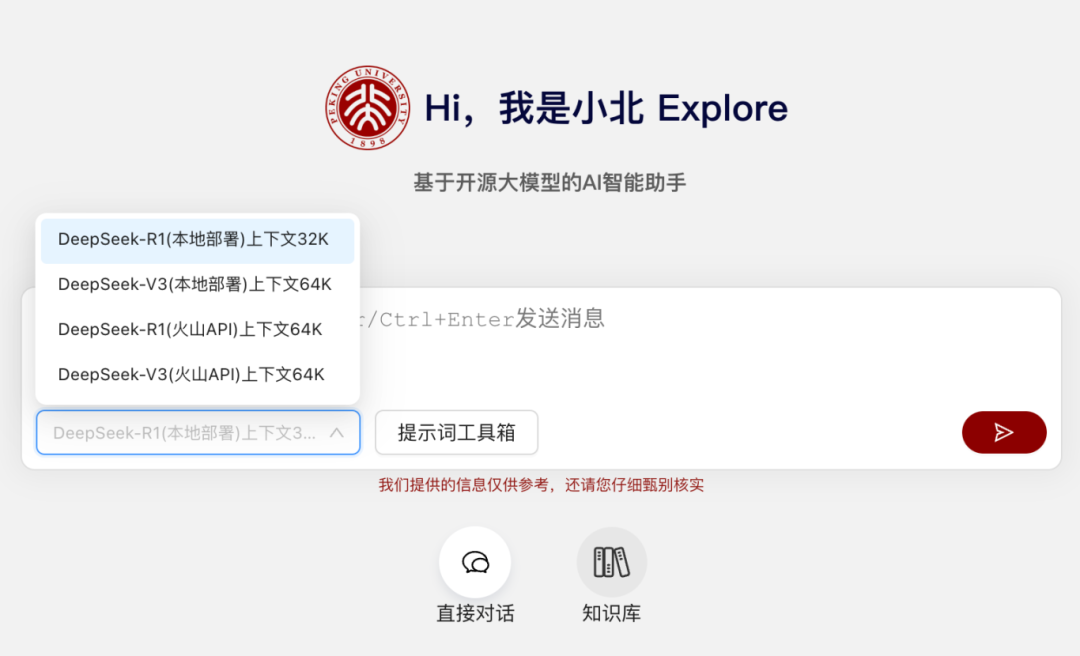 “小北学长”是北大AI智能校园学习生活助手。其借助知识库与大语言模型相结合的架构,整合多种资源,针对北大师生学习、工作与生活中出现的问题,提供即时、详细且准确的解答。接入DeepSeek-R1、DeepSeek-V3,即将上线的“小北Explore”将为北大教职工及同学,带来当下大热AI的实时体验。