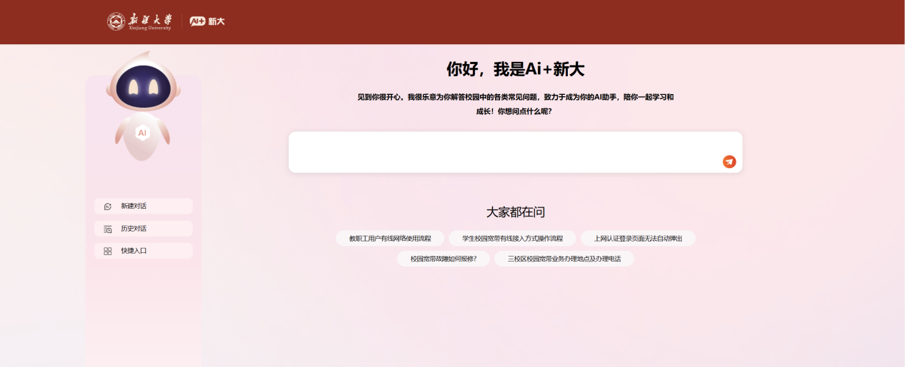 新疆大学完成智能AI应用平台——Ai+新大(简称“爱新大”)的搭建,并开展试点应用服务。该平台基于检索增强生成(RAG)技术,构建了一个高效、智能的知识服务系统,深度融合了学校本地部署的DeepSeek模型,旨在为全校师生提供更便捷、更精准的校园业务咨询与信息检索服务。