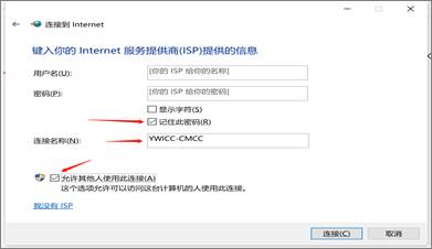 第三步:在弹出的对话框中:输入宽带账号和密码,连接名称手动输入“YWICC-CMCC”。